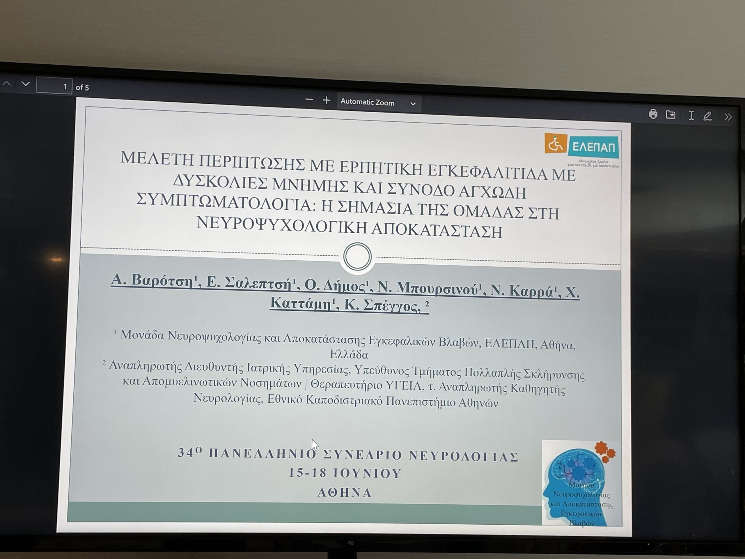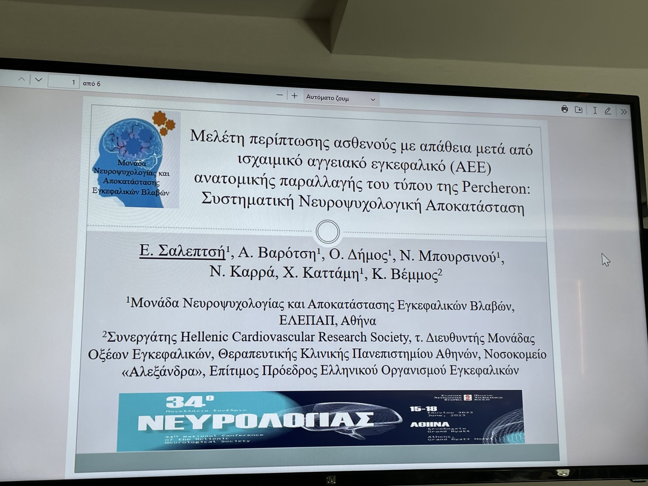 Η ΜΟΝΑΔΑ ΝΕΥΡΟΨΥΧΟΛΟΓΙΑΣ ΚΑΙ ΑΠΟΚΑΤΑΣΤΑΣΗΣ ΕΓΚΕΦΑΛΙΚΩΝ ΒΛΑΒΩΝ της ΕΛΕΠΑΠ συμμετείχε στο 34ο Πανελλήνιο Συνέδριο Νευρολογίας κατά το διάστημα 15-18 Ιουνίου 2023, στο Ξενοδοχείο Grand Hyatt στην Αθήνα. Η Μονάδα, πραγματοποίησε 2 προφορικές ανακοινώσεις για το εξειδικευμένο Ομαδικό πρόγραμμα Αποκατάστασης Λόγου και ανήρτησε 2 e–posters της εξέλιξης περιστατικών ειδικού ενδιαφέροντος.