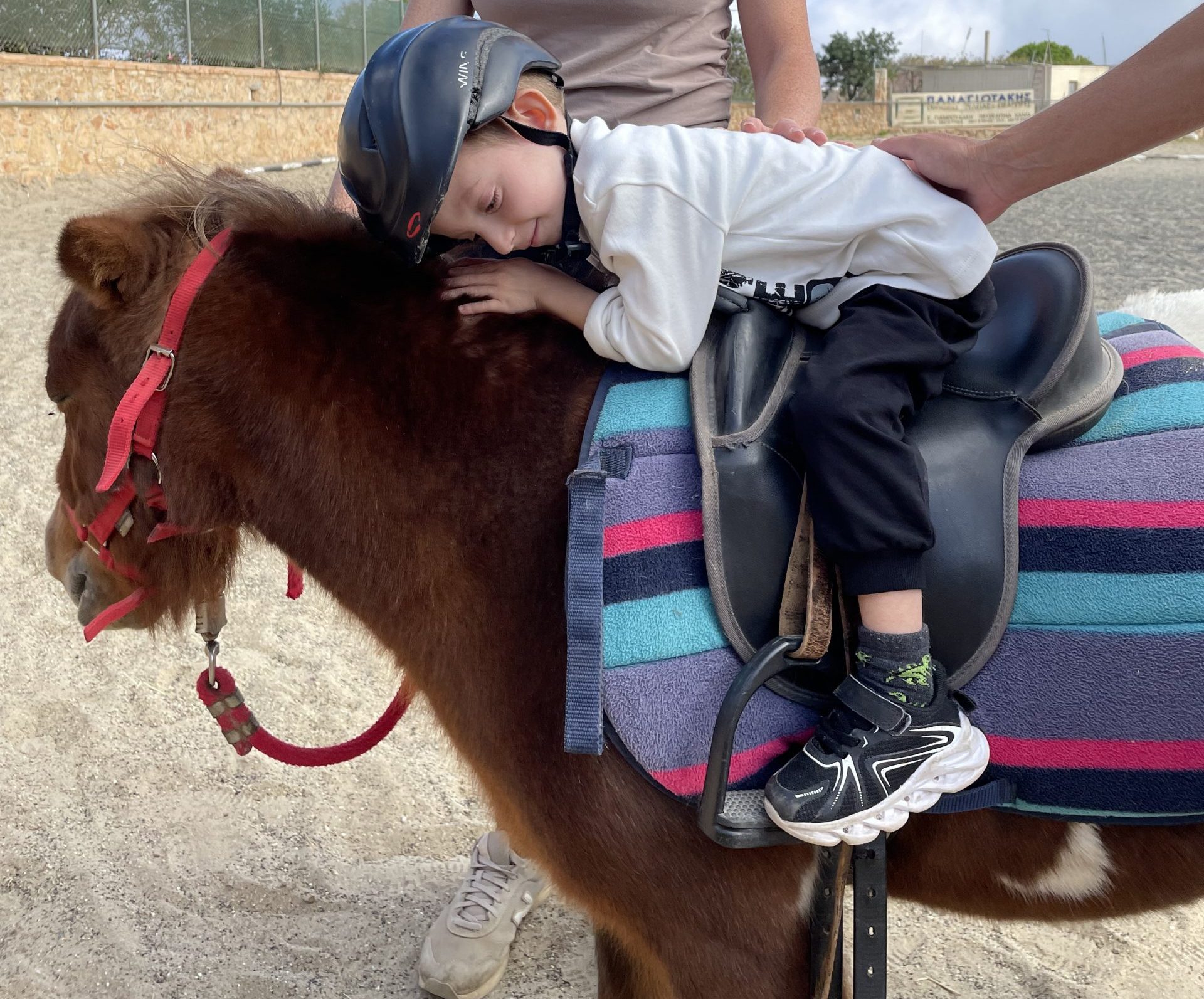 Οι ειδικοί παιδαγωγοί ήταν δίπλα στους μικρούς ιππείς για να τους βοηθήσουν να ξεπεράσουν την οποιαδήποτε αναστολή και να δεχτούν όλα εκείνα τα έντονα ερεθίσματα που προκύπτουν κατά τη διάρκεια της θεραπευτικής ιππασίας.