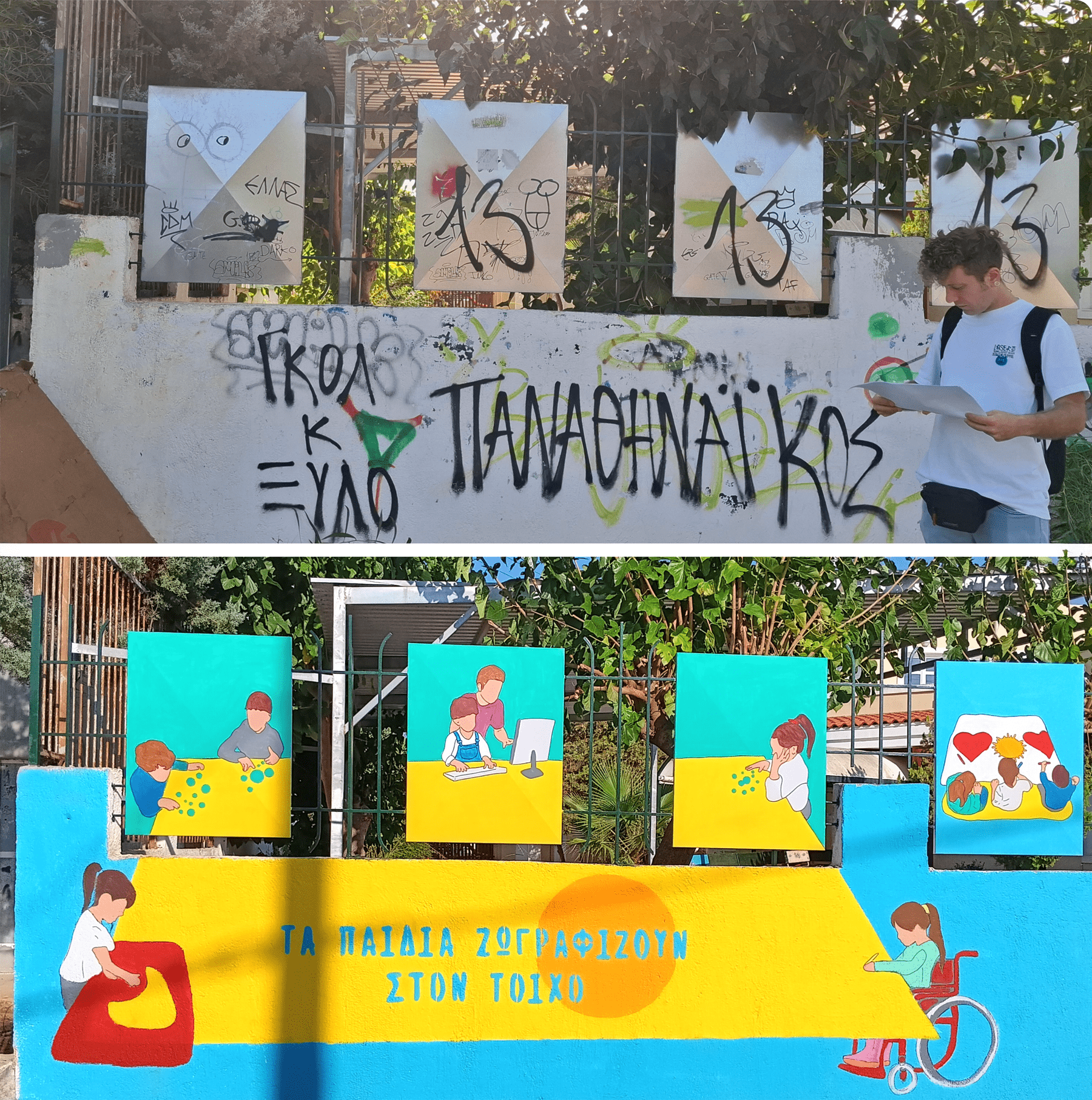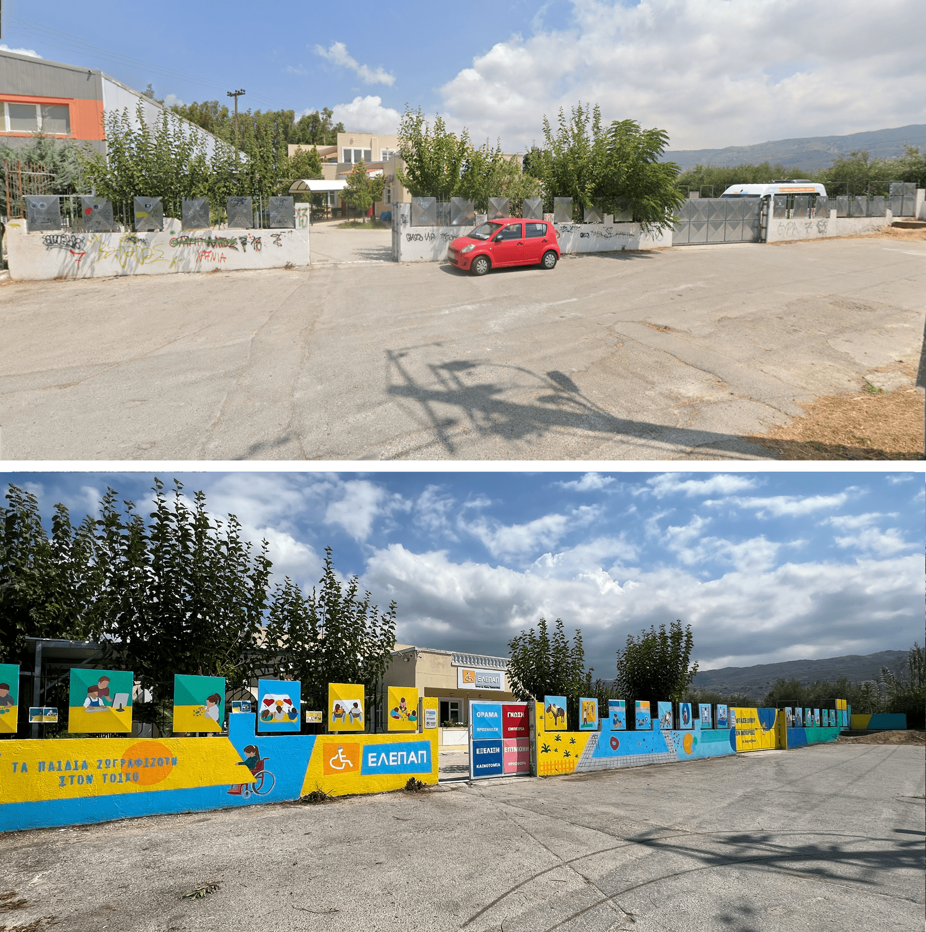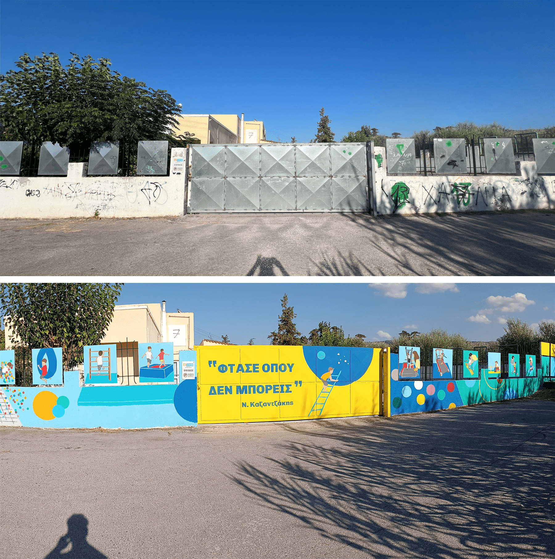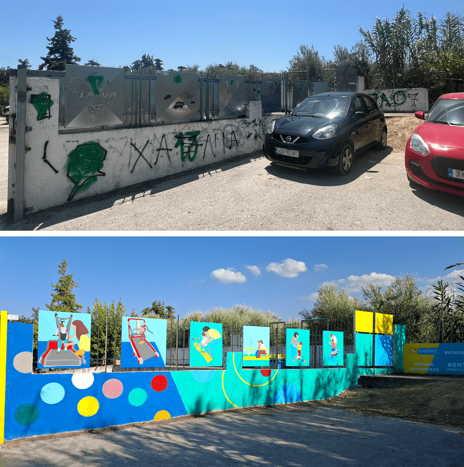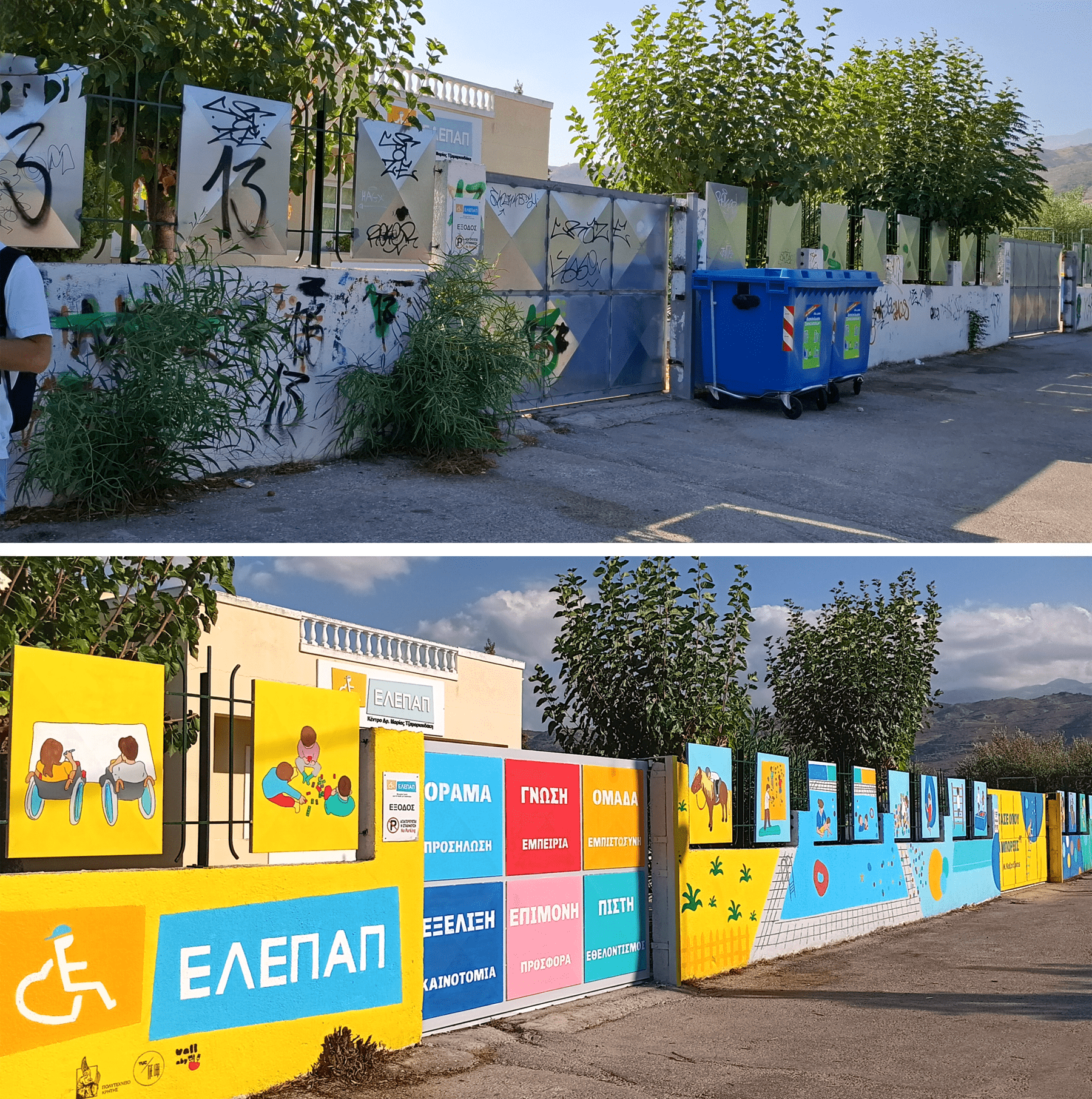 Για τρεις μέρες, ξεκινώντας από την Παρασκευή 30 Αυγούστου, νωρίς το πρωί, η ομάδα του έργου φιλοτέχνησε με περίσσεια φροντίδα, αγάπη και ενθουσιασμό την μέχρι σήμερα γκρι και πολλάκις βανδαλισμένη εξωτερική περίφραξη, δίνοντας νότες χαράς και αισιοδοξίας.