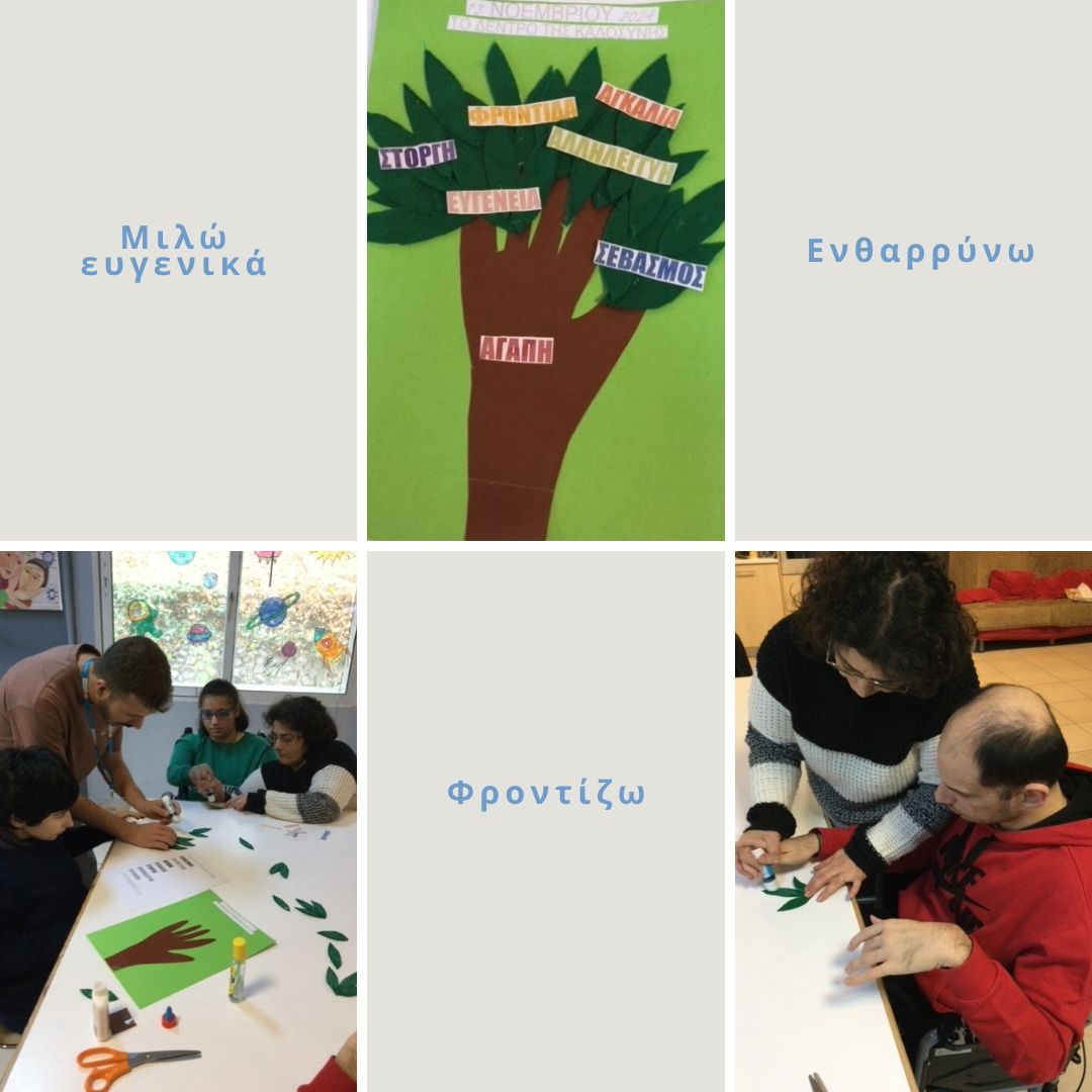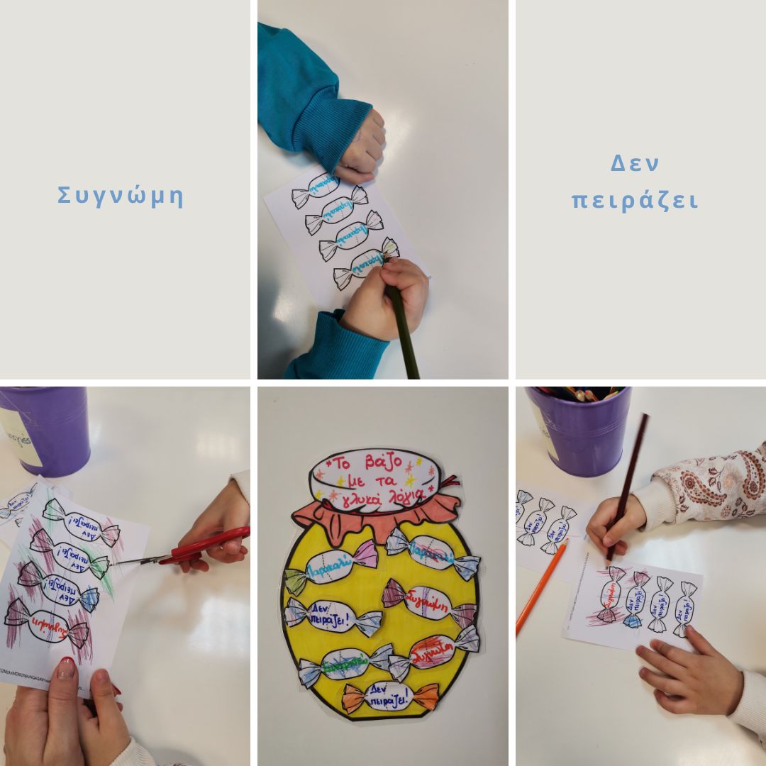 Γράψανε στα μπαλόνια τους τα πιο όμορφα μηνύματα και τα κρέμασαν στο δέντρο της καλοσύνης. Στη συνέχεια ζωγράφισαν, έκοψαν και τοποθέτησαν τις λέξεις στο βάζο με τα “γλυκά” λόγια.
