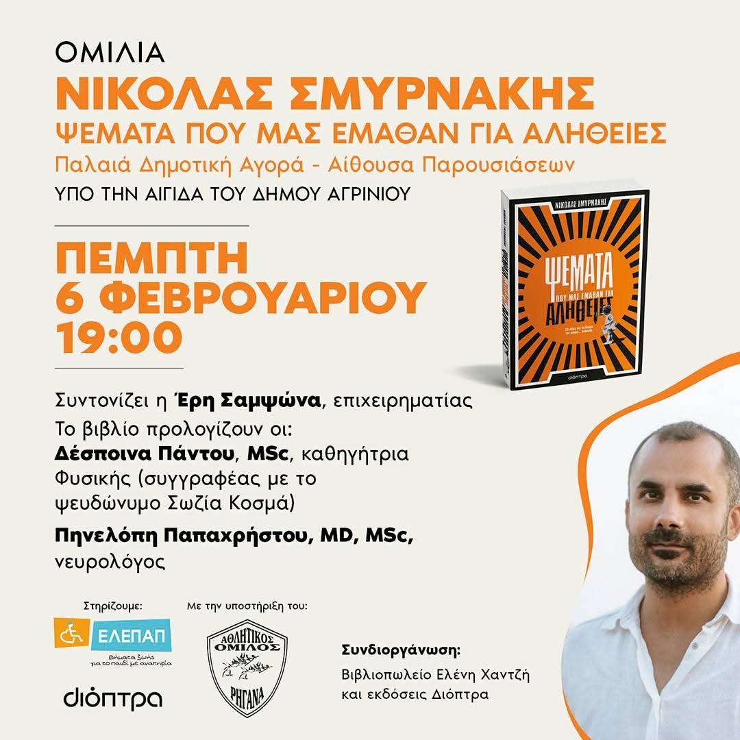 Στις 6 Φεβρουαρίου στην Δημοτική Αγορά Αγρινίου πραγματοποιήθηκε η παρουσίαση του βιβλίου «Ψέματα που μας έμαθαν για Αλήθειες» του συγγραφέα Νικόλα Σμυρνάκη. Η εκδήλωση ήταν αφιερωμένη στα Γενναία Παιδιά της ΕΛΕΠΑΠ με καλεσμένη την πρόεδρο του παραρτήματος Αγρινίου κα Λαμπρινή Κολοβού, η οποία παρουσίασε στους παρευρισκόμενους το έργο της ΕΛΕΠΑΠ.