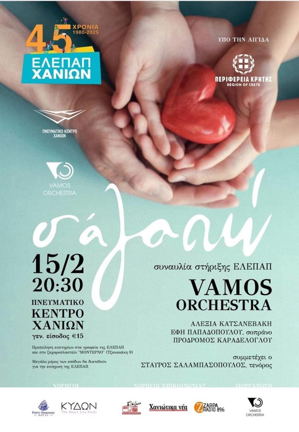 Στις 15 Φεβρουαρίου το μουσικό σύνολο Vamos Orchestra συγχρονίστηκε με τις φωνές της Αλεξίας Κατσανεβάκη , της σοπράνο Έφης Παπαδοπούλου , του Πρόδρομου Καραδελόγλου και του τενόρου Σταύρου Σαλαμπασόπουλου και γέμισαν με μουσική και στίχους γεμάτους αγάπη το κατάμεστο από θεατές θέατρο του Πνευματικού Κέντρου Χανίων.