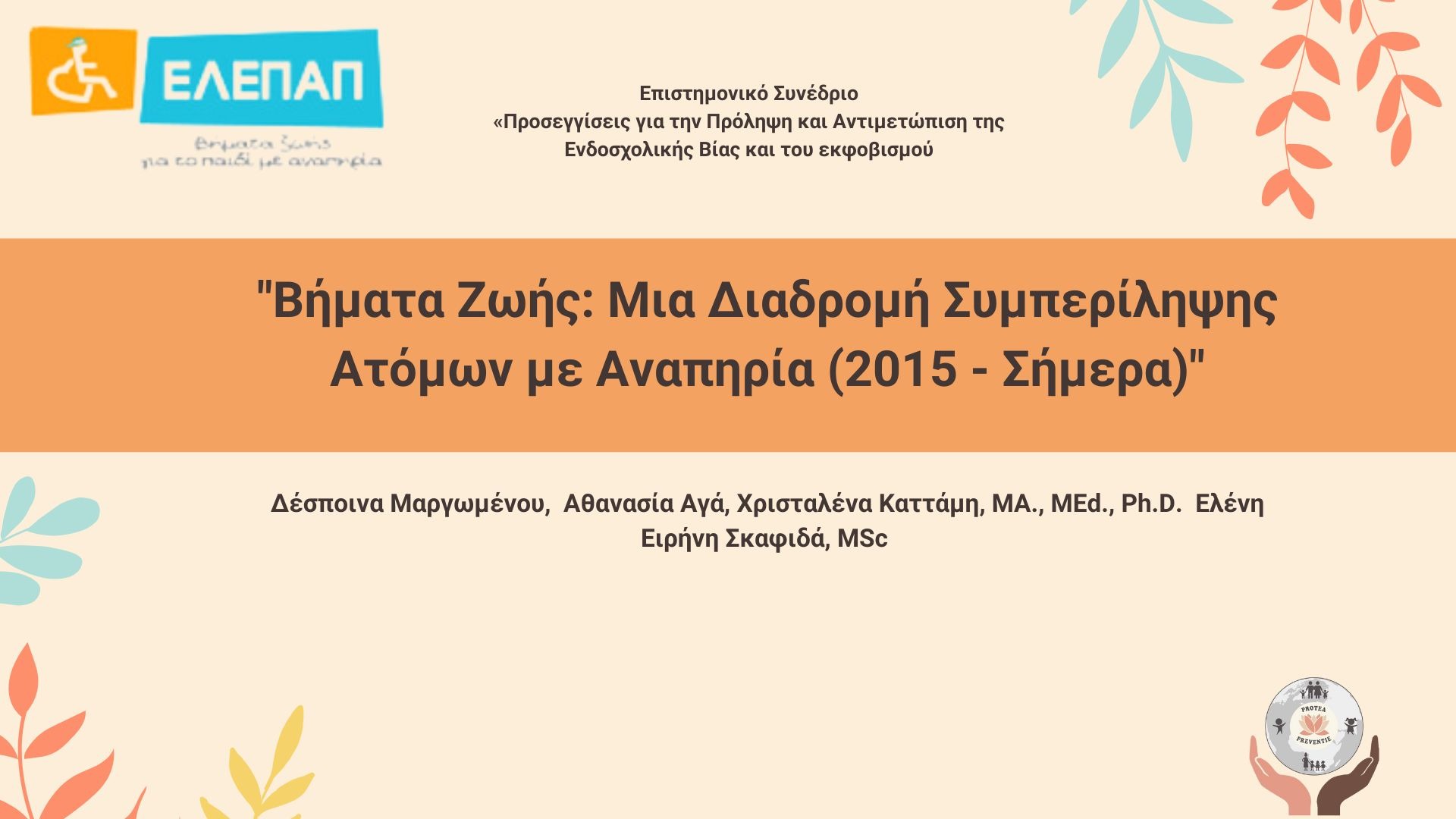 Με την ομιλία “Βήματα Ζωής: Μια διαδρομή συμπερίληψης Ατόμων με Αναπηρία (2015 – Σήμερα)” η ΕΛΕΠΑΠ συμμετείχε στο Επιστημονικό Συνέδριο “Προσεγγίσεις για την Πρόληψη και Αντιμετώπιση της Ενδοσχολικής Βίας και Εκφοβισμού “, που διοργάνωσε το Ινστιτούτο Εκπαιδευτικής Πολιτικής στις 8 Μαρτίου 2025.