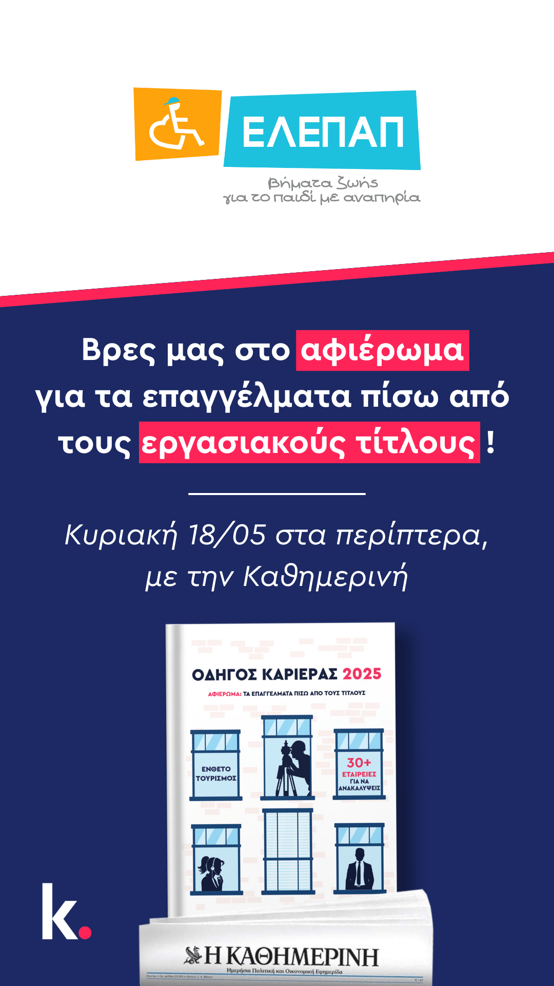Στον φετινό Οδηγό, που κυκλοφορεί αυτή την Κυριακή 18/05 με την Καθημερινή, οι αναγνώστες θα έχουν την ευκαιρία να ανακαλύψουν όχι μόνο τι πραγματικά κρύβεται πίσω από τους σύγχρονους επαγγελματικούς τίτλους — αλλά και παράλληλα, πώς μπορούν να στηρίξουν το πολυετές έργο της ΕΛΕΠΑΠ.