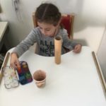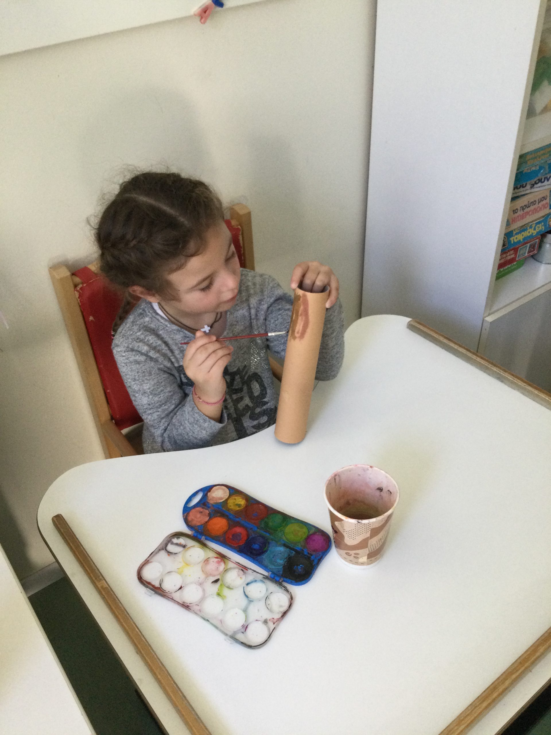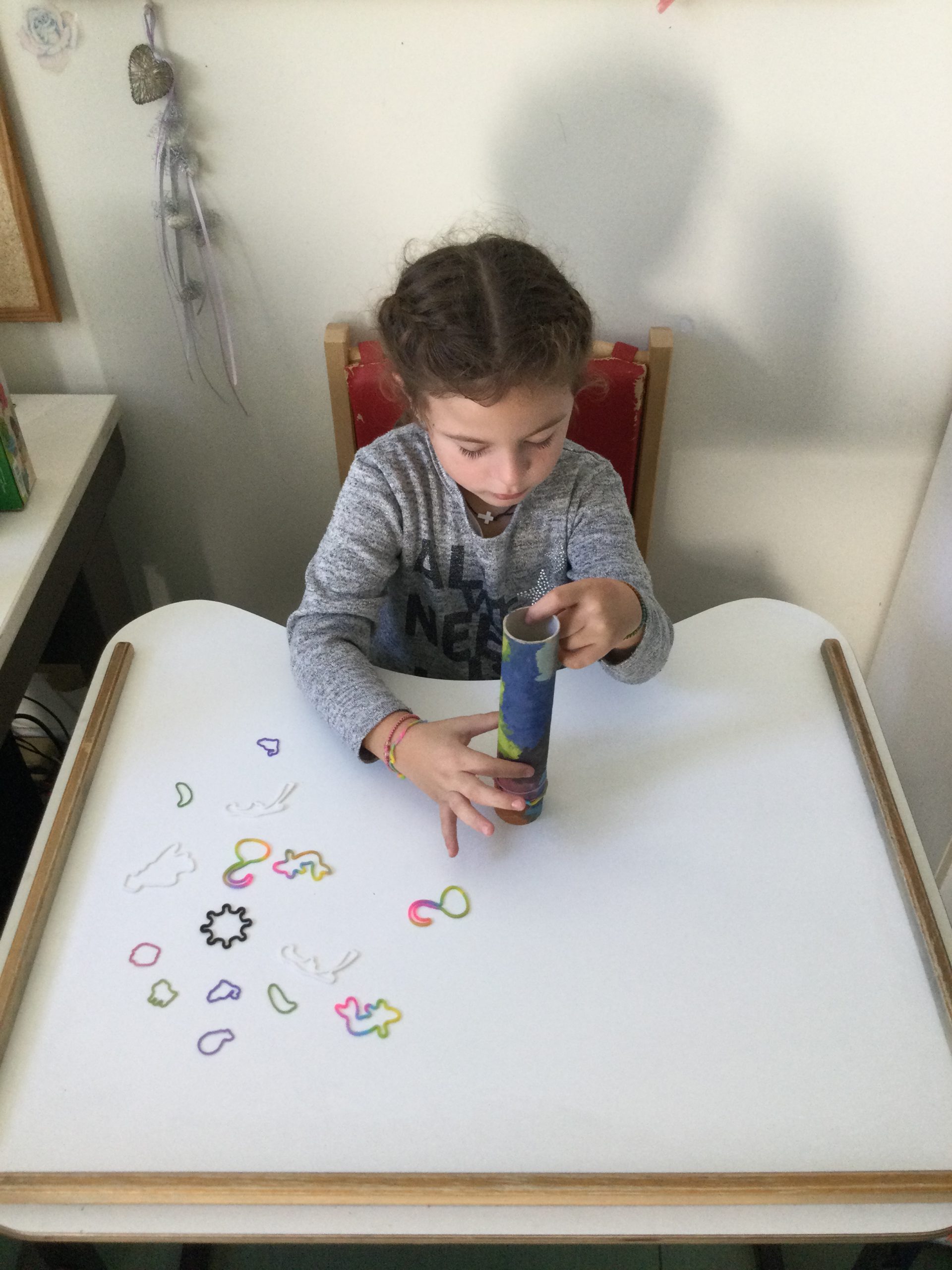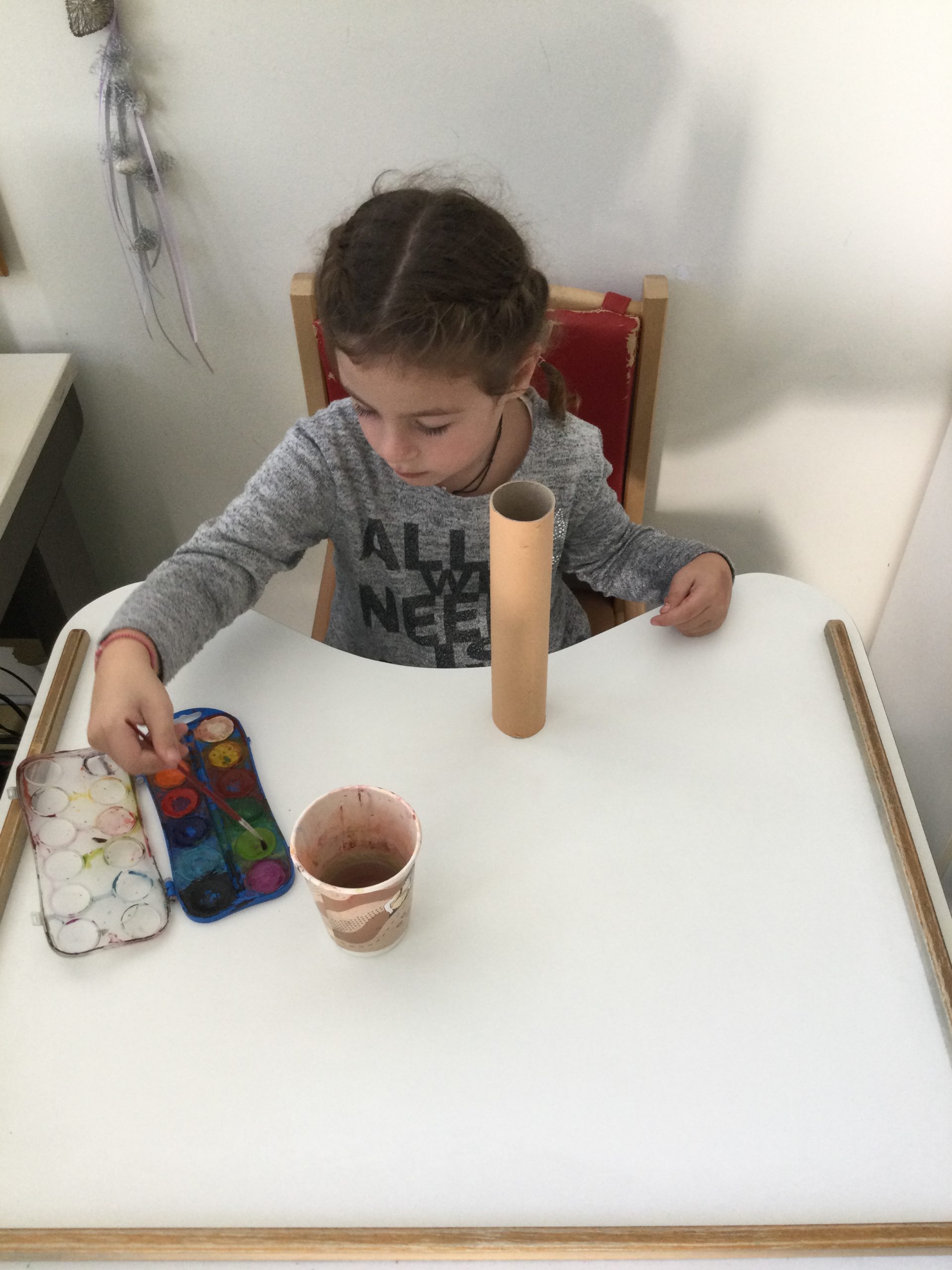 Στη δραστηριότητα με το ρολό, αρχικά το παιδί ζωγραφίζει με το πινέλο (λεπτή κίνηση, λαβή), ενώ στη συνέχεια περνάει λάστιχα διάφορων μεγεθών και αντίστασης στο ρολό, με στόχο να ενδυναμωθούν η παλάμη και τα δάκτυλα.
