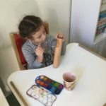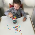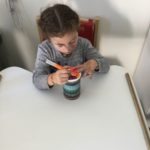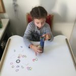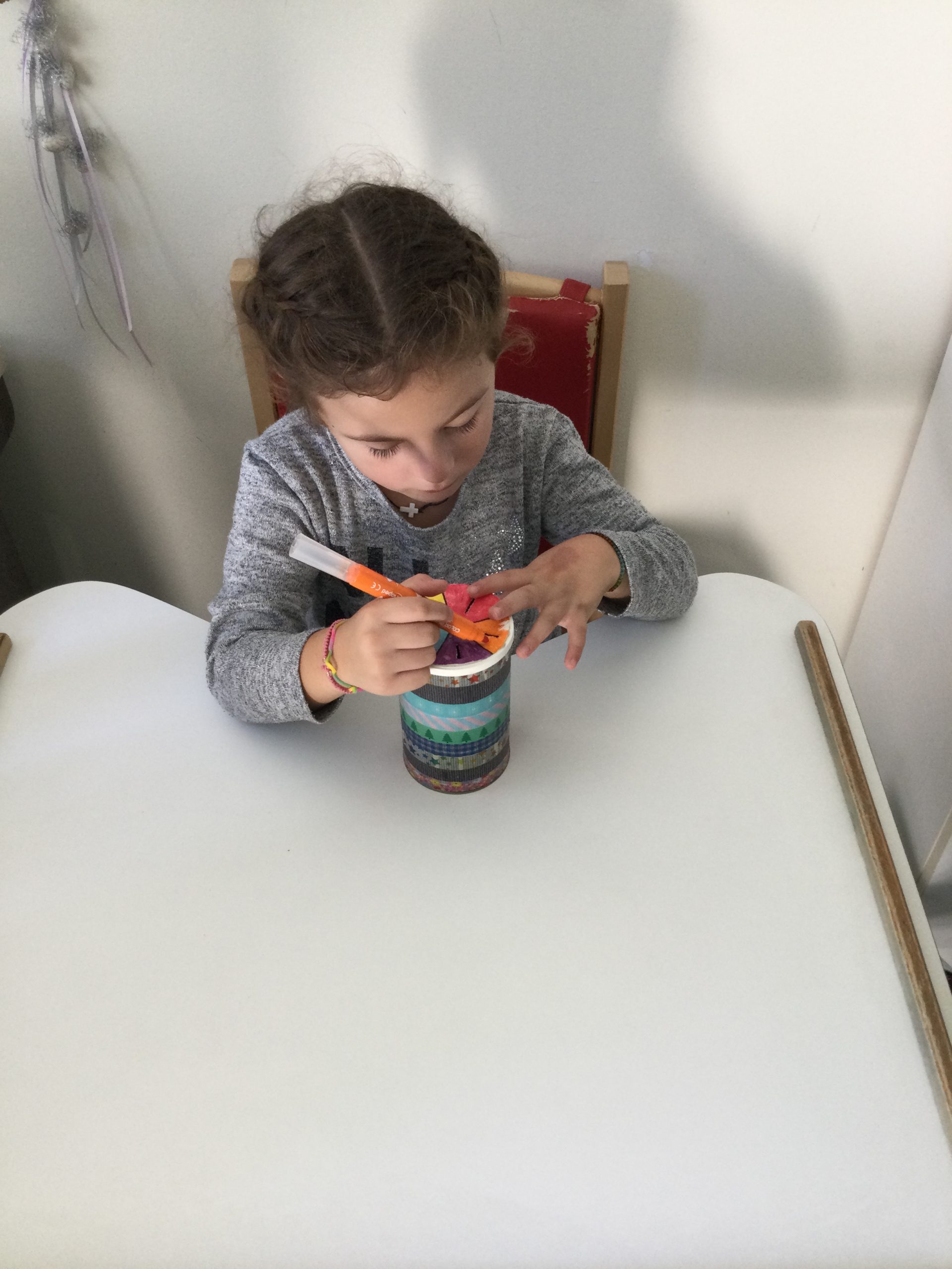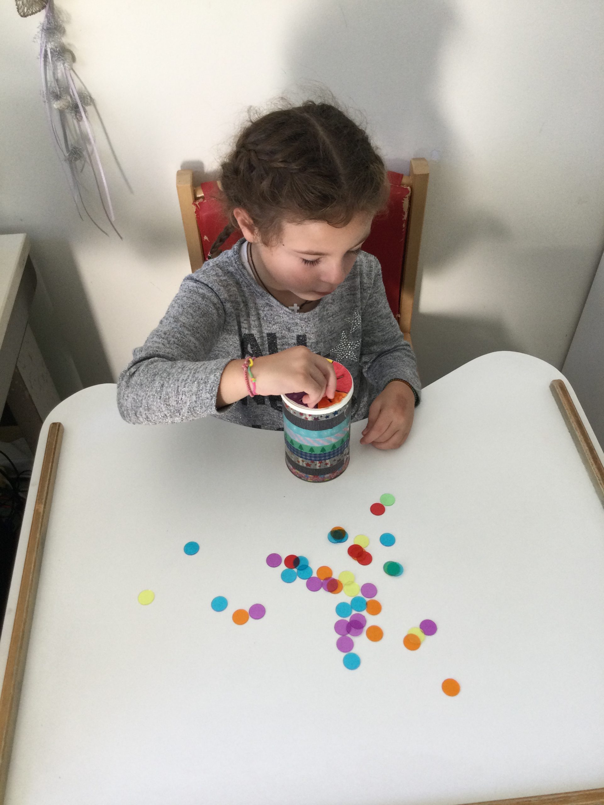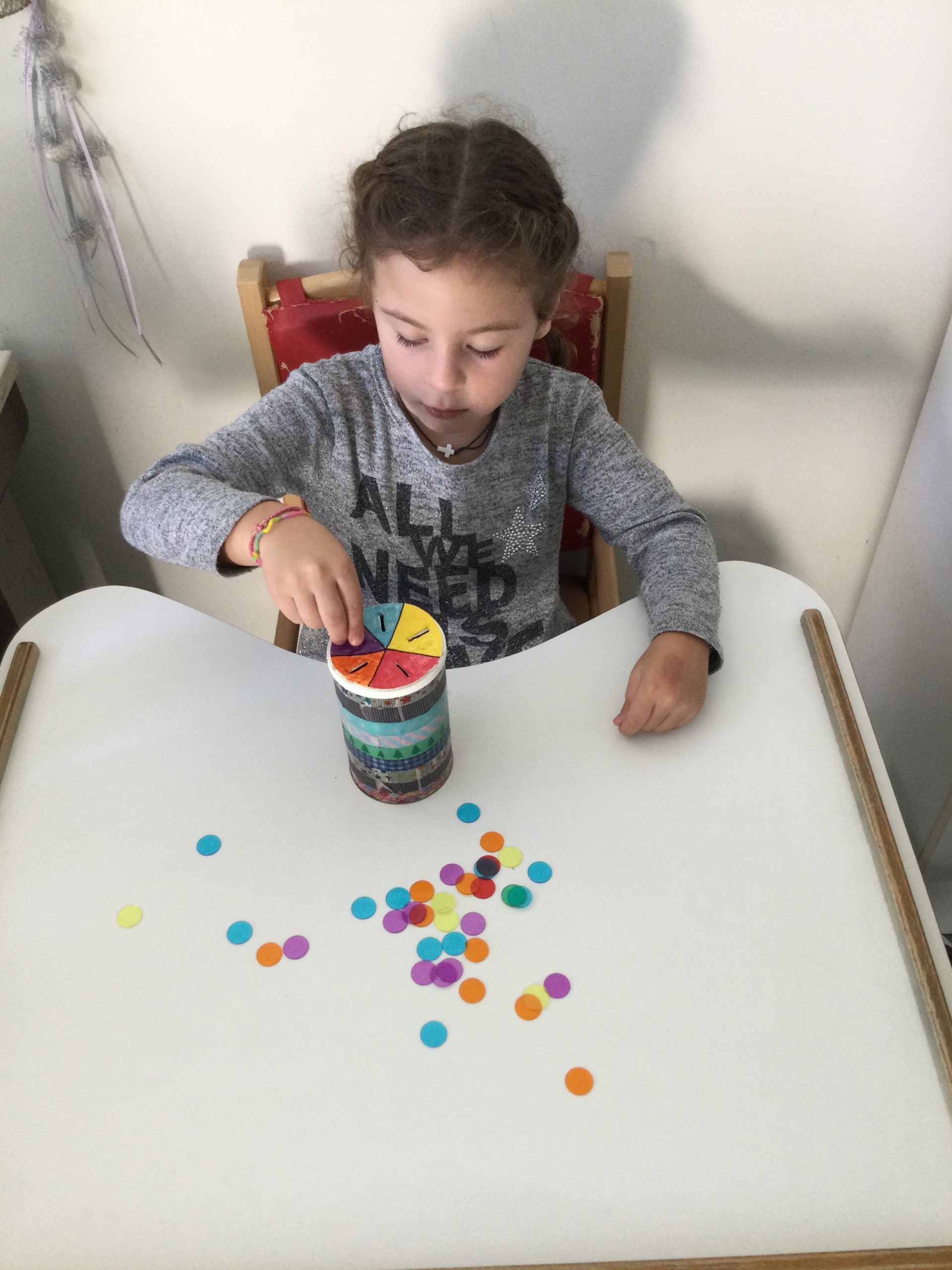 Στη δραστηριότητα με το κουτί-κουμπαρά, το παιδί ζωγραφίζει με μαρκαδόρους και κολλάει το χαρτί (λεπτή κίνηση, λαβή, οπτικοκινητικός συντονισμός). Στη συνέχεια, ρίχνει τα κέρματα στις σχισμές διαφορετικών μεγεθών, χρωμάτων και επιπέδων δυσκολίας (λεπτή κίνηση, λαβή, συλληπτική ικανότητα, εκμάθηση και ταύτιση χρωμάτων).